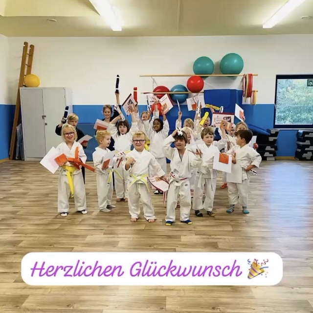 Ein breites Lachen, glänzende Augen und pure Freude. Das sind unsere tollen Schüler nach ihrer bestandenen Gürtelprüfung. Stolz und voller Energie halten sie ihre neuen Gürtel und Urkunden in die Höhe.